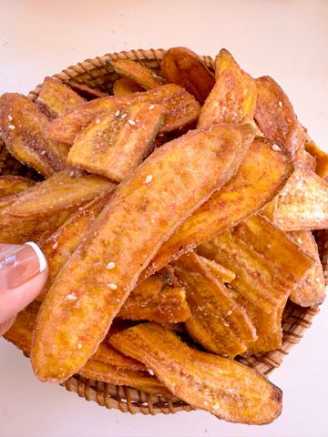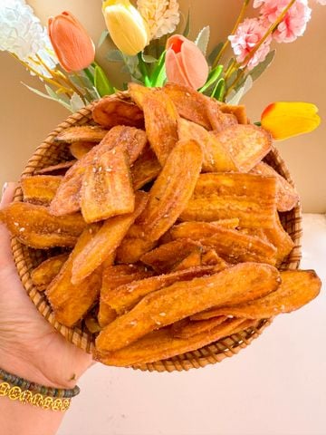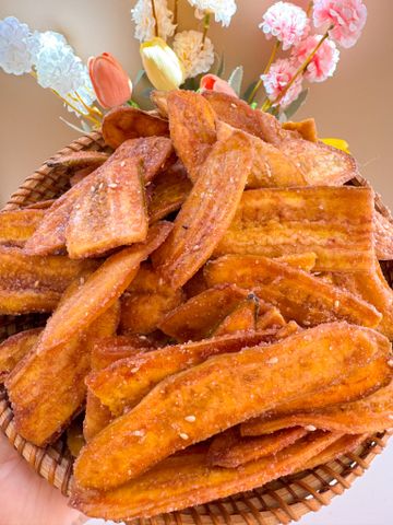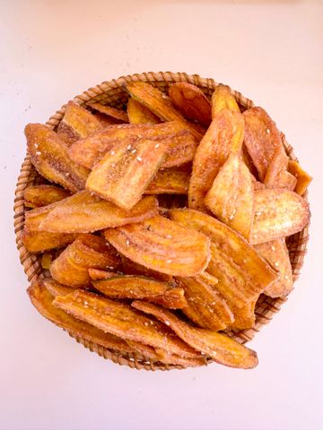 Từng lát chuối già dài – sấy giòn phủ mè, đường & gừng, thơm ngọt tự nhiên, giòn rụm dễ nhai, không quá cứng – món ăn vặt truyền thống mà ai ăn cũng thích!