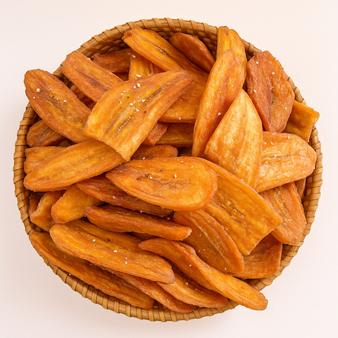 Chuối già sấy giòn mè gừng – lát dài giòn rụm, vị ngọt đậm, thơm mè bùi gừng nhẹ. Ăn vặt truyền thống dễ ghiền – không quá cứng – tiện lợi bảo quản.
