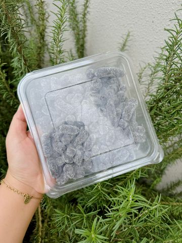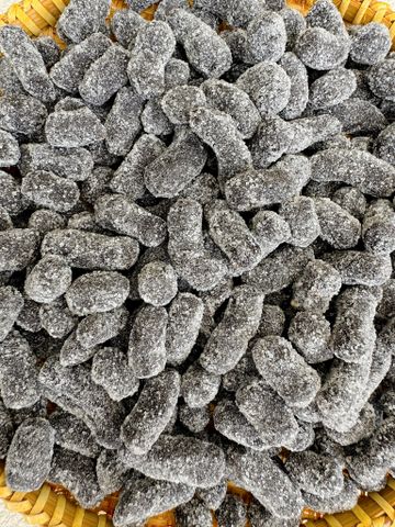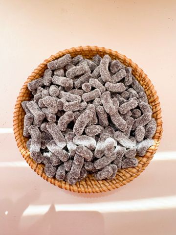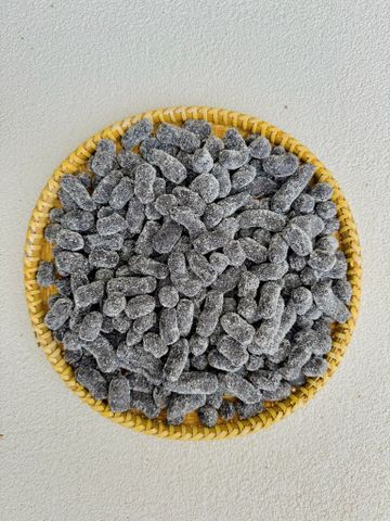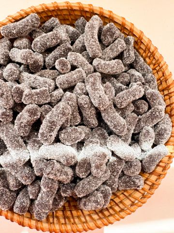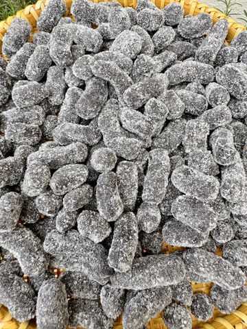 Kẹo dẻo dâu tằm thon dài – vị chua ngọt rõ, dẻo dai khô ráo, không quá cứng. Viên nhỏ phủ đường – ăn là mê, nhâm nhi cực thích!