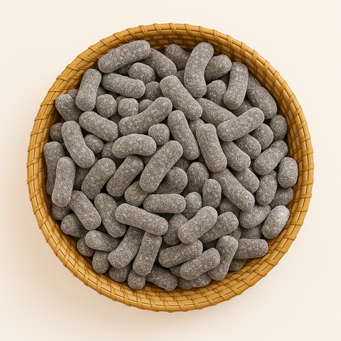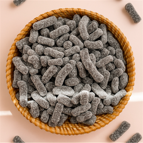Kẹo dẻo vị dâu tằm đậm đà, viên thon dài phủ đường mịn, vị chua rõ – ngọt nhẹ – thơm lừng, nhai dẻo vui miệng – cực hợp để nhâm nhi mỗi ngày!