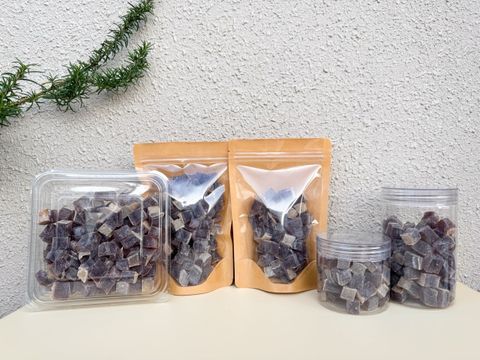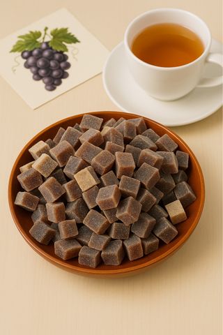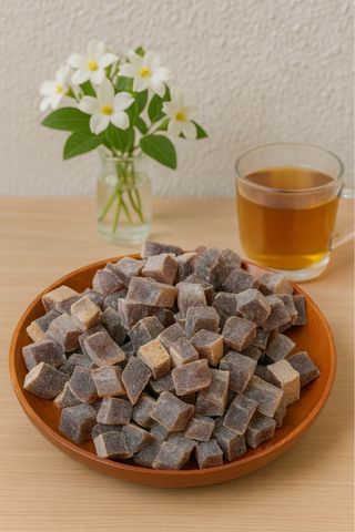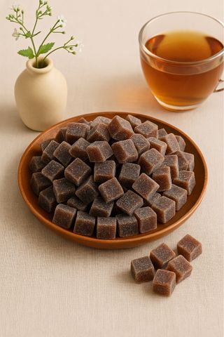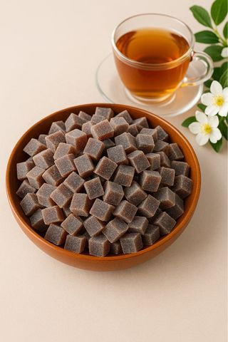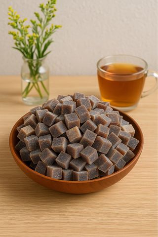 Từng viên kẹo dẻo vuông nhỏ xinh, được phủ nhẹ lớp bột đường bên ngoài, màu đen nâu