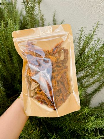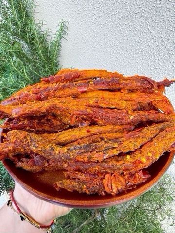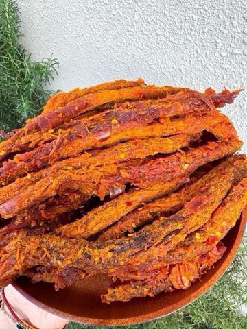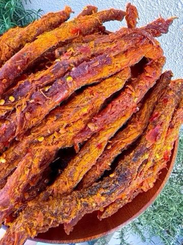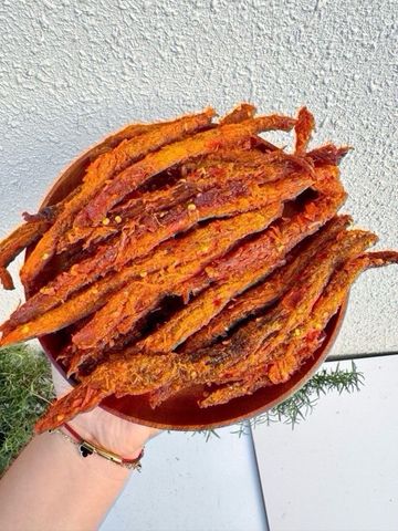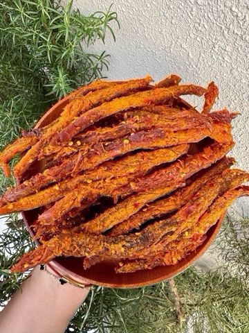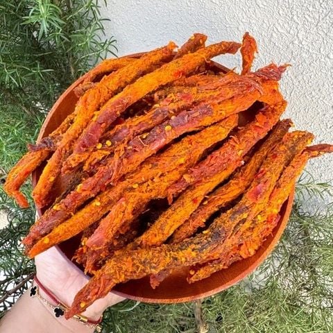• Chế biến: Sấy khô kỹ lưỡng kết hợp tẩm gia vị đậm đà, tạo thành từng que dài đều đặn, dễ cầm – dễ ăn
