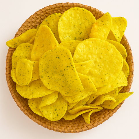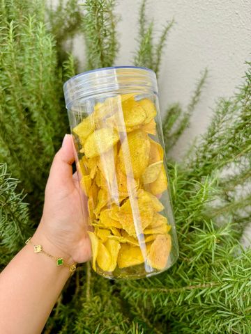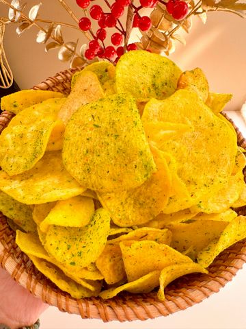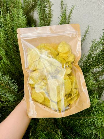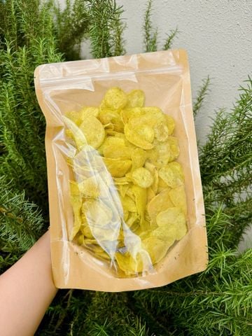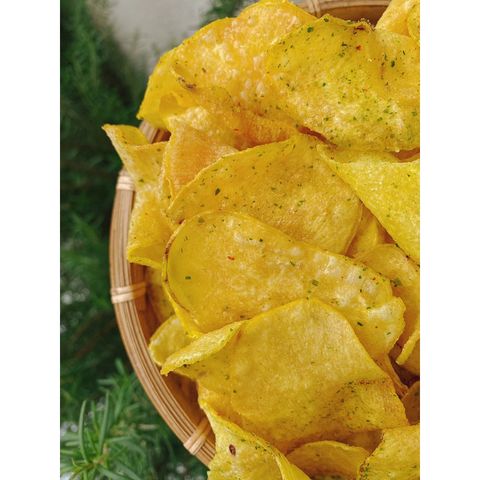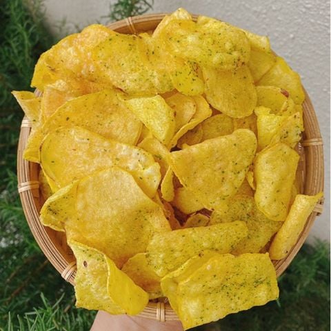 Lát khoai lang vàng Đà Lạt mỏng vừa, sấy giòn kết hợp cùng hành lá tươi, tiêu, mắm – đậm vị, thơm lừng. Vị bùi béo – mặn nhẹ – giòn rụm, ăn vặt cực cuốn, phù hợp mọi lứa tuổi.