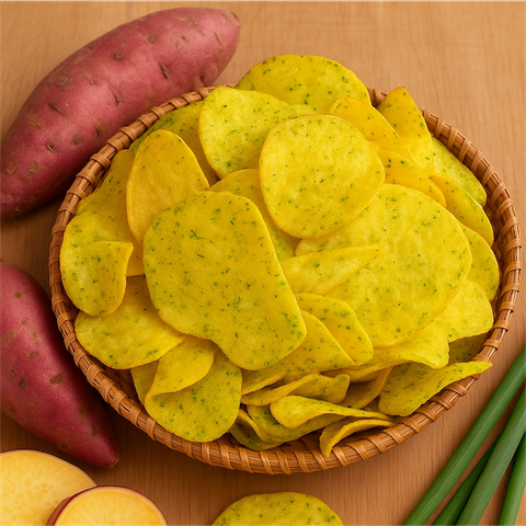 Khoai lang sấy giòn mắm hành – lát mỏng giòn rụm, bùi béo thơm hành – mặn nhẹ đậm vị. Ăn vặt cực cuốn, giòn xốp không cứng, tiện lợi dễ bảo quản.