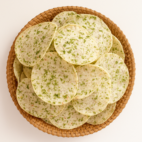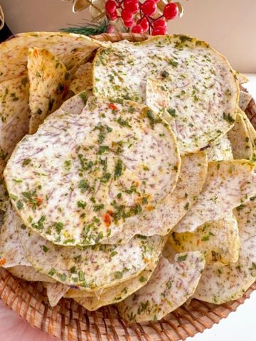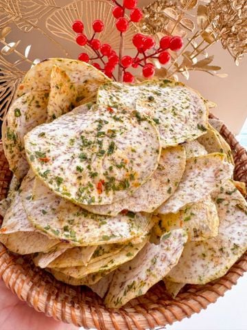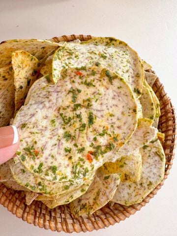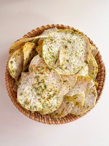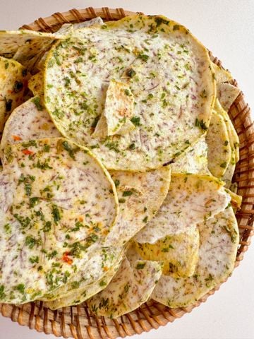 Từng lát khoai môn Đà Lạt mỏng, sấy giòn với hành lá, tép khô, mắm muối – vị béo bùi – mặn thơm, ăn vào nhớ ngay món bánh tráng mắm hành trứ danh. Giòn kiểu dai, cực kỳ cuốn!