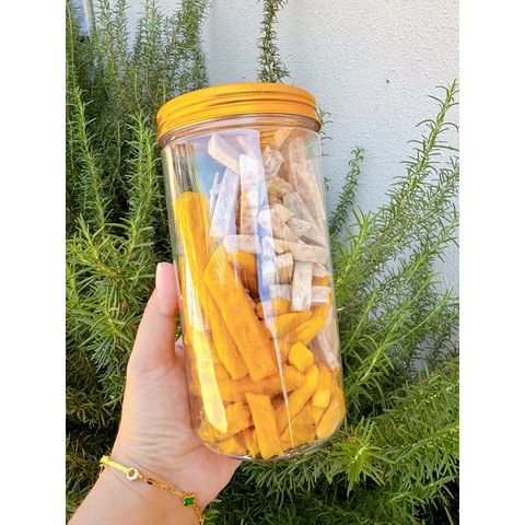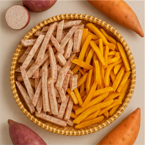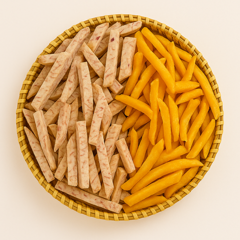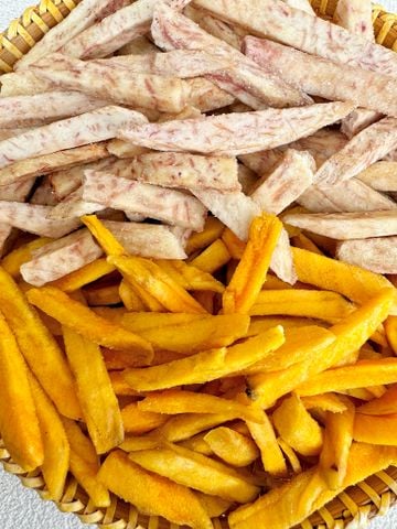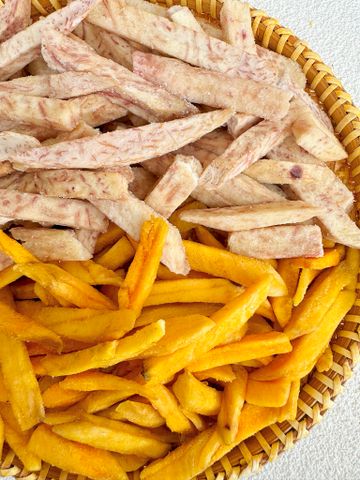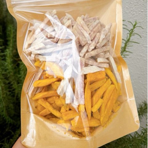 Kết hợp hoàn hảo khoai lang vàng & khoai môn Đà Lạt, sấy giòn từng cọng vuông nhỏ, không tẩm đường, giữ nguyên vị béo bùi – ngọt nhẹ tự nhiên – món ăn vặt lành mạnh, giòn rụm cực đã!