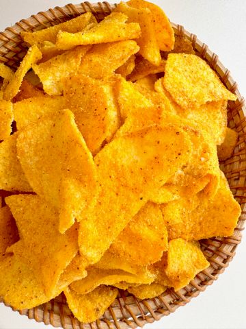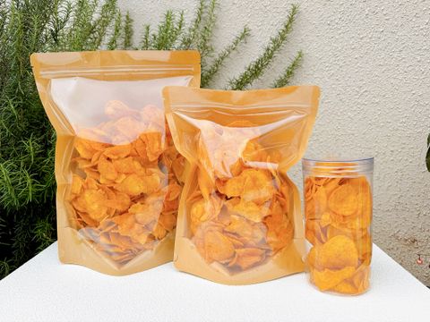 • Phương pháp: Sấy giòn từng lát mỏng, phủ bột phô mai & trứng muối