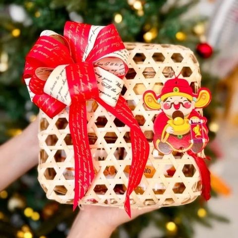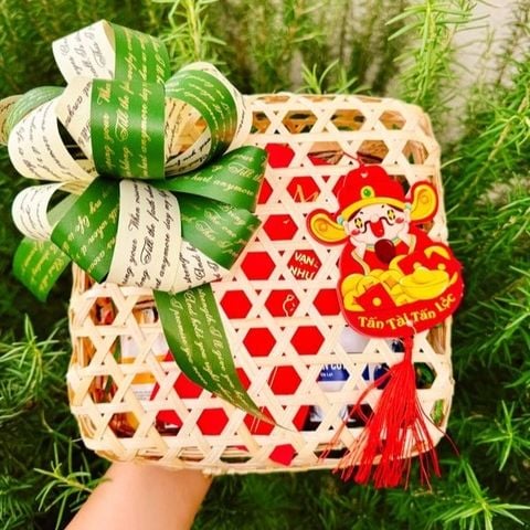 • Set quà tặng gồm : Hộp mây kích thước đường kính 20cm x cao 10cm, đựng vừa 4 hũ mứt tròn [tuỳ chọn], nơ tú cầu, tag Tết