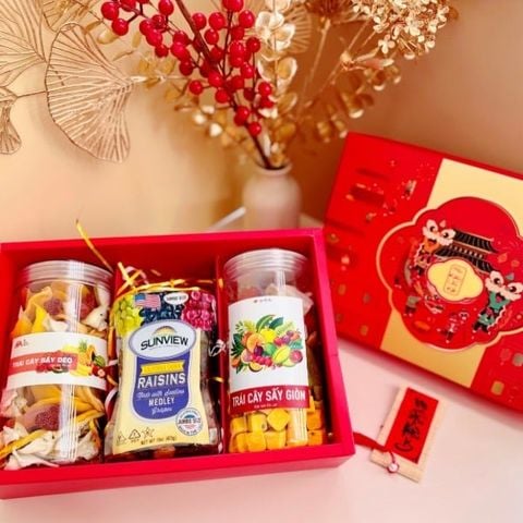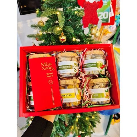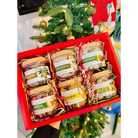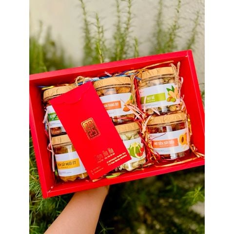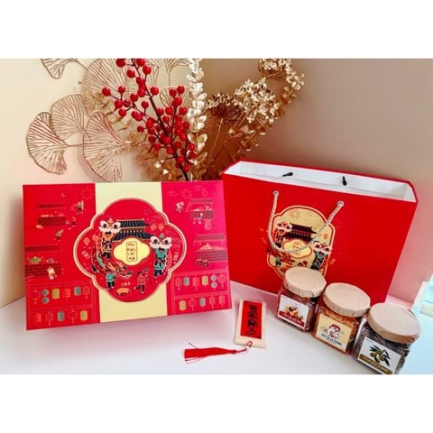 • Set quà tặng gồm : Hộp giấy cứng kích thước D31 x R21.5 x cao 10cm, đựng vừa 6 hũ mứt tròn [tuỳ chọn], rơm lót, túi giấy đi kèm