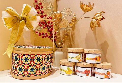 Giỏ mây tròn với họa tiết xâu hoa nhiều màu, có quai xách, mang vẻ đẹp đơn giản và sang trọng. Kích thước 20 x 15 cm, giỏ có thể chứa vừa 3 hũ mứt tròn hoặc 4 hũ mứt vuông, cùng với 1 gói cà phê.