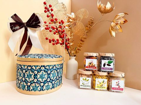 Giỏ mây tròn với họa tiết xâu hoa nhiều màu, có quai xách, mang vẻ đẹp đơn giản và sang trọng. Kích thước 20 x 15 cm, giỏ có thể chứa vừa 3 hũ mứt tròn hoặc 4 hũ mứt vuông, cùng với 1 gói cà phê.