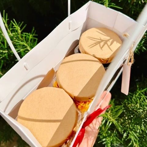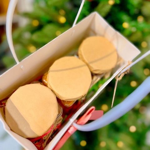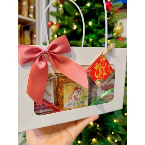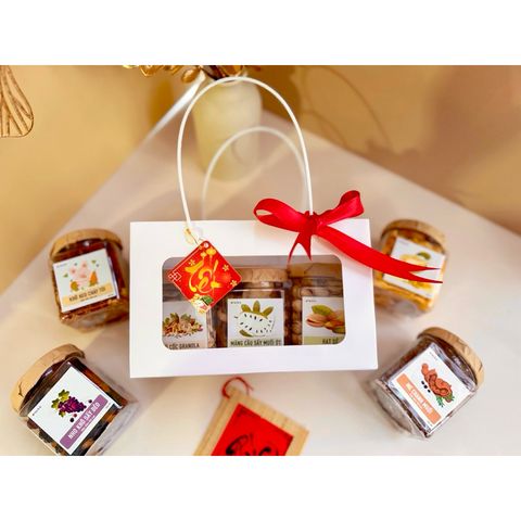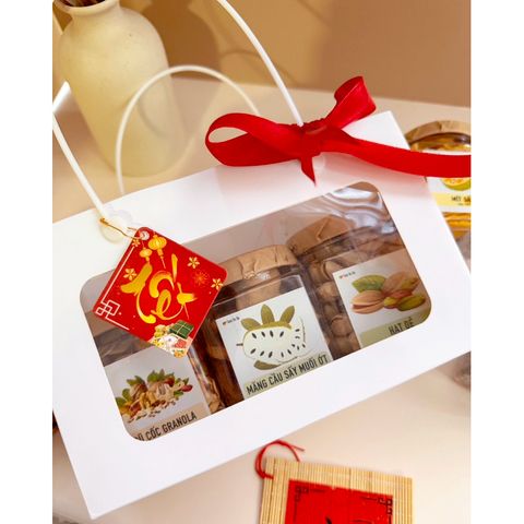• Set hộp quà tặng gồm : Túi giấy trắng quai nhựa trắng, đựng vừa 3 hũ mứt [tuỳ chọn], nơ lụa, tag Tết